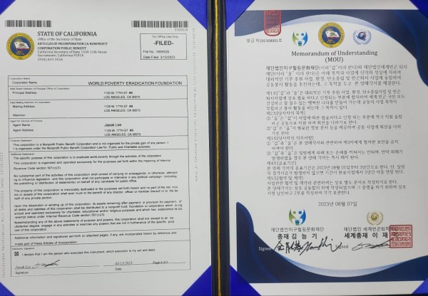 세계빈곤퇴치재단 이재억 총재님과 지구힐링문화재단 김능기 재단 이사장은 MOU를 체결하고 세계빈곤퇴치와 지구 쓰레기, 환경에 동참하기로 하였습니다.